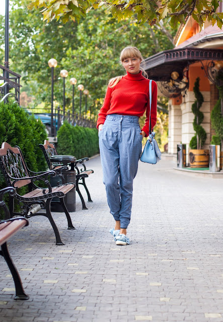 И немного о моём образе:Вы можете заметить, что я выбрала голубой цвет как базу, такой себе пастельный, нежный оттенок и разбавила его более осенним, глубоким - кирпично-красным оттенком. Как Вам такое цветовое решение?))